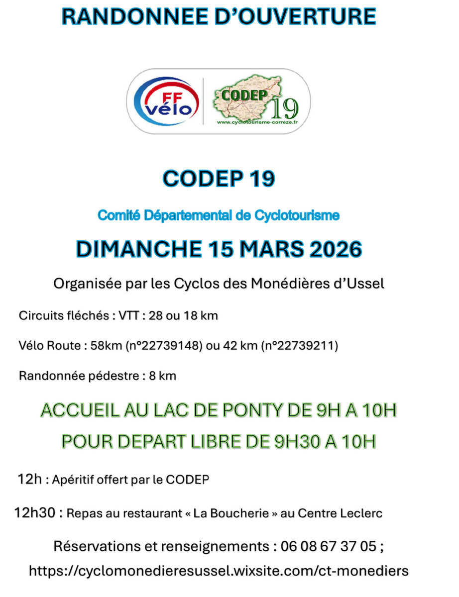 Réservations et renseignements : 06 08 67 37 05 ; https://cyclomonedieresussel.wixsite.com/ct-monediers